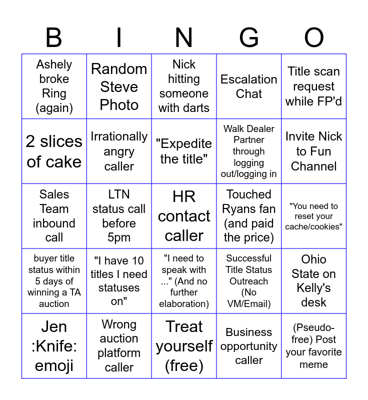 This bingo card has 25 words: buyer title status within 5 days of winning a TA auction, Wrong auction platform caller, HR contact caller, Business opportunity caller, Title scan request while FP'd, Ashely broke Ring (again), Random Steve Photo, Nick hitting someone with darts, Touched Ryans fan (and paid the price), Ohio State on Kelly's desk, 2 slices of cake, Irrationally angry caller, Treat yourself (free), Successful Title Status Outreach (No VM/Email), Invite Nick to Fun Channel, Jen :Knife: emoji, LTN status call before 5pm, "Expedite the title", Walk Dealer Partner through logging out/logging in, "You need to reset your cache/cookies", Sales Team inbound call, "I have 10 titles I need statuses on", "I need to speak with ..." (And no further elaboration), Escalation Chat and (Pseudo-free) Post your favorite meme.