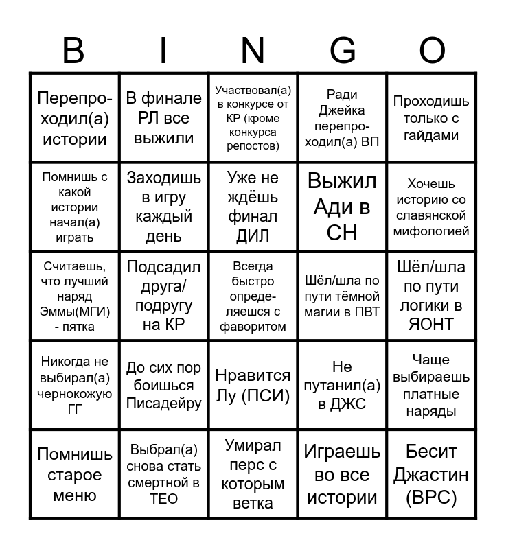 This bingo card has 25 words: До сих пор боишься Писадейру, Умирал перс с которым ветка, Уже не ждёшь финал ДИЛ, Помнишь старое меню, Проходишь только с гайдами, Перепро- ходил(а) истории, Помнишь с какой истории начал(а) играть, В финале РЛ все выжили, Шёл/шла по пути тёмной магии в ПВТ, Нравится Лу (ПСИ), Выжил Ади в СН, Считаешь, что лучший наряд Эммы(МГИ) - пятка, Не путанил(а) в ДЖС, Чаще выбираешь платные наряды, Заходишь в игру каждый день, Бесит Джастин (ВРС), Шёл/шла по пути логики в ЯОНТ, Участвовал(а) в конкурсе от КР (кроме конкурса репостов), Хочешь историю со славянской мифологией, Подсадил друга/подругу на КР, Всегда быстро опреде- ляешся с фаворитом, Выбрал(а) снова стать смертной в ТЕО, Никогда не выбирал(а) чернокожую ГГ, Ради Джейка перепро-ходил(а) ВП and Играешь во все истории.