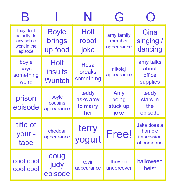This bingo card has 25 words: cheddar appearance, kevin appearance, Rosa breaks something, cool cool cool cool, Gina singing / dancing, they dont actually do any police work in the episode, boyle says something weird, Boyle brings up food, Amy being stuck up joke, terry yogurt, nikolaj appearance, prison episode, Free!, Jake does a horrible impression of someone, Holt insults Wuntch, halloween heist, teddy stars in the episode, Holt robot joke, amy talks about office supplies, boyle cousins appearance, teddy asks amy to marry her, doug judy episode, title of your - tape, amy family member appearance and they go undercover.