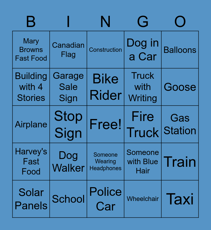 This bingo card has a free space and 24 words: Dog Walker, School, Bike Rider, Solar Panels, Balloons, Mary Browns Fast Food, Building with 4 Stories, Canadian Flag, Fire Truck, Someone Wearing Headphones, Truck with Writing, Airplane, Someone with Blue Hair, Train, Garage Sale Sign, Wheelchair, Gas Station, Construction, Goose, Stop Sign, Taxi, Harvey's Fast Food, Dog in a Car and Police Car.