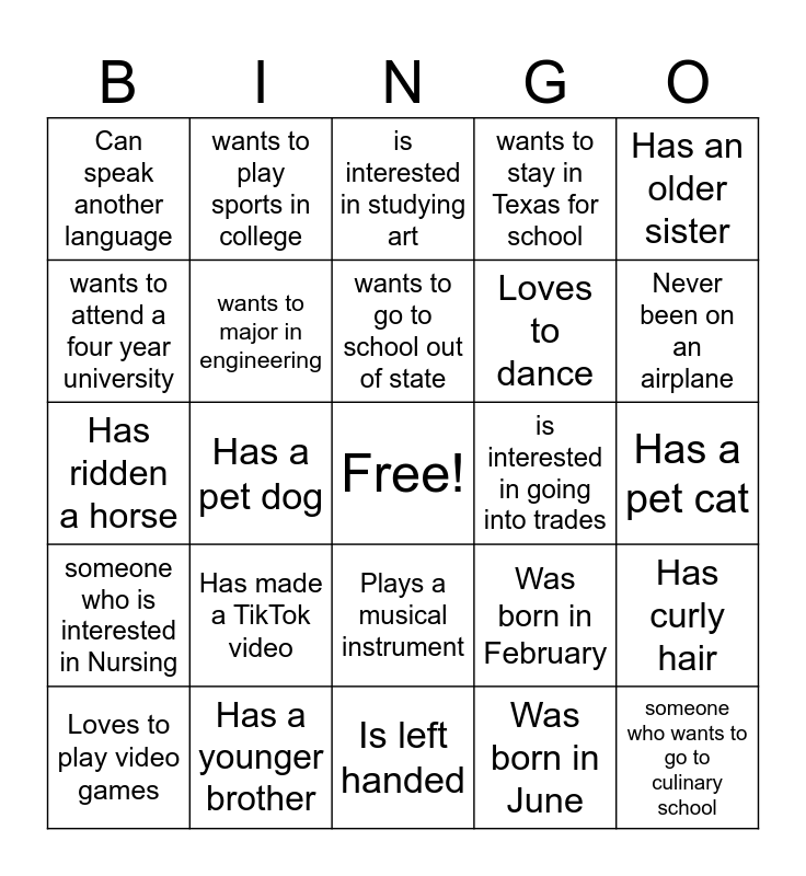 This bingo card has a free space and 25 words: someone who is interested in Nursing, Has a younger brother, Is left handed, Was born in June, Has an older sister, Can speak another language, wants to play sports in college, is interested in studying art, is interested in going into trades, Has curly hair, wants to attend a four year university, wants to major in engineering, Is an only child, Was born in February, Never been on an airplane, Loves to play video games, Has a pet dog, wants to go to school out of state, Loves to dance, Has a pet cat, Has ridden a horse, Has made a TikTok video, Plays a musical instrument, wants to stay in Texas for school and someone who wants to go to culinary school.