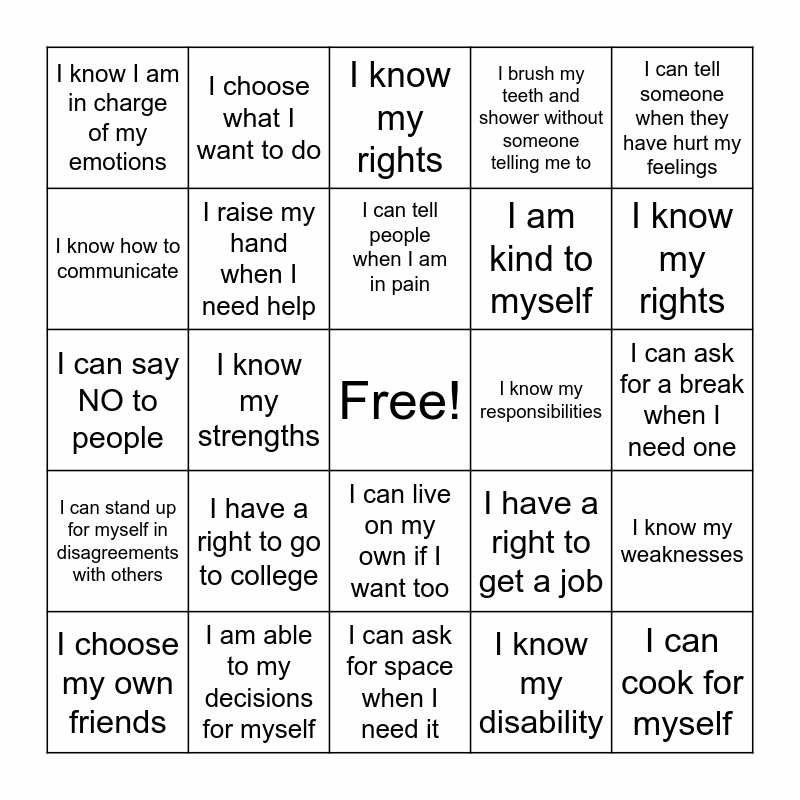 This bingo card has a free space and 34 words: I can make my own doctor appointments, I know my disability, I know how to cook for myself, I have good hygiene, I can stand up for myself in disagreements with others, I raise my hand when I need help, I can tell someone when they have hurt my feelings, I choose my own friends, I choose what I want to do, I choose what food I like to eat, I can tell people when I am in pain, I know my rights, I know how to get help incase of an emergency, I choose, I know my responsibilities, I know my rights, I am able to my decisions for myself, I can say NO to people, I have a right to go to college, I have a right to get a job, I can live on my own if I want too, I speak up for myself, I know I am in charge of my emotions, I can ask for a break when I need one, I can ask for space when I need it, I can cook for myself, I brush my teeth and shower without someone telling me to, I do not let people bully me, I am kind to myself, I know how to communicate, I know what my accommodations are, I know my strengths, I know my weaknesses and I am not afraid to say "I need help".
