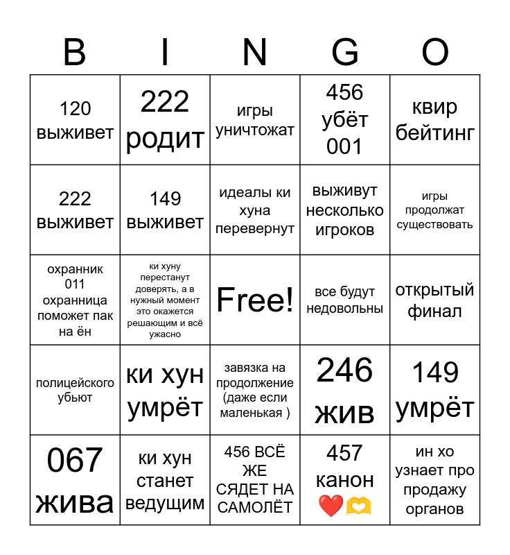 This bingo card has a free space and 24 words: ки хун умрёт, ки хун станет ведущим, идеалы ки хуна перевернут, 067 жива, квир бейтинг, 120 выживет, 222 выживет, 222 родит, все будут недовольны, завязка на продолжение (даже если маленькая ), выживут несколько игроков, охранник 011 охранница поможет пак на ён, 246 жив, 149 умрёт, 149 выживет, 457 канон ❤️🫶, открытый финал, игры уничтожат, игры продолжат существовать, ки хуну перестанут доверять, а в нужный момент это окажется решающим и всё ужасно, ин хо узнает про продажу органов, полицейского убьют, 456 убёт 001 and 456 ВСЁ ЖЕ СЯДЕТ НА САМОЛЁТ.