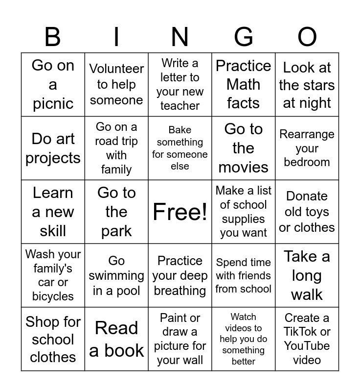 This bingo card has a free space and 24 words: Go swimming in a pool, Read a book, Bake something for someone else, Shop for school clothes, Look at the stars at night, Go on a picnic, Do art projects, Volunteer to help someone, Make a list of school supplies you want, Practice your deep breathing, Go to the movies, Learn a new skill, Spend time with friends from school, Take a long walk, Go on a road trip with family, Watch videos to help you do something better, Donate old toys or clothes, Write a letter to your new teacher, Rearrange your bedroom, Go to the park, Create a TikTok or YouTube video, Wash your family's car or bicycles, Practice Math facts and Paint or draw a picture for your wall.