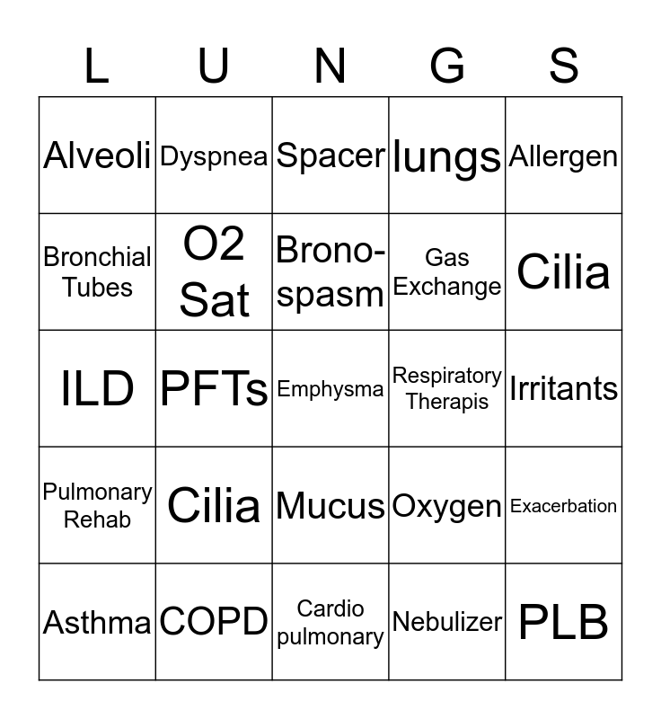 This bingo card has a free space and 24 words: Cilia, COPD, Brono-spasm, Asthma, Allergen, Alveoli, Bronchial Tubes, Dyspnea, Respiratory Therapis, Mucus, Gas Exchange, ILD, Oxygen, Exacerbation, O2 Sat, Nebulizer, Irritants, Spacer, Cilia, PFTs, PLB, Pulmonary Rehab, lungs and Cardio pulmonary.