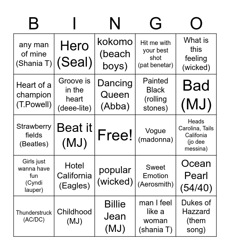 This bingo card has a free space and 26 words: popular (wicked), man I feel like a woman (shania T), Dancing Queen (Abba), Childhood (MJ), What is this feeling (wicked), any man of mine (Shania T), Heart of a champion (T.Powell), Hero (Seal), Heads Carolina, Tails Califonia (jo dee messina), Sweet Emotion (Aerosmith), Painted Black (rolling stones), Strawberry fields (Beatles), Ocean Pearl (54/40), Thunderstruck (AC/DC), Beat it (MJ), The final countdown (Europe), Hit me with your best shot (pat benetar), Girls just wanna have fun (Cyndi lauper), kokomo (beach boys), Dukes of Hazzard (them song), Bad (MJ), Billie Jean (MJ), Vogue (madonna), Hotel California (Eagles), Groove is in the heart (deee-lite) and oh canada (classified).