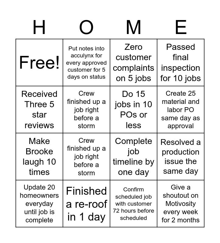 This bingo card has 16 words: Update 20 homeowners everyday until job is complete, Finished a re-roof in 1 day, Zero customer complaints on 5 jobs, Passed final inspection for 10 jobs, Received Three 5 star reviews, Put notes into acculynx for every approved customer for 5 days on status, Complete job timeline by one day, Resolved a production issue the same day, Free!, Crew finished up a job right before a storm, Confirm scheduled job with customer 72 hours before scheduled, Create 25 material and labor PO same day as approval, Make Brooke laugh 10 times, Crew finished up a job right before a storm, Do 15 jobs in 10 POs or less and Give a shoutout on Motivosity every week for 2 months.