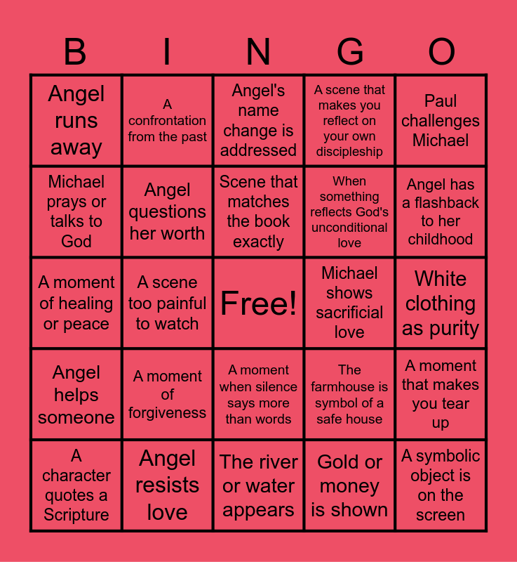 This bingo card has a free space and 24 words: A character quotes a Scripture, A moment of forgiveness, Scene that matches the book exactly, Gold or money is shown, Paul challenges Michael, Angel runs away, A confrontation from the past, Angel's name change is addressed, Michael shows sacrificial love, White clothing as purity, A moment of healing or peace, Angel questions her worth, The farmhouse is symbol of a safe house, A moment that makes you tear up, Michael prays or talks to God, Angel resists love, The river or water appears, A scene that makes you reflect on your own discipleship, Angel has a flashback to her childhood, Angel helps someone, A scene too painful to watch, A moment when silence says more than words, When something reflects God's unconditional love and A symbolic object is on the screen.