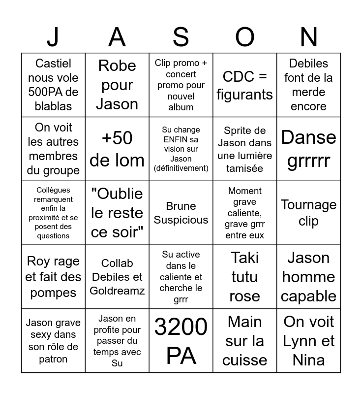 This bingo card has a free space and 24 words: Collab Debiles et Goldreamz, Jason en profite pour passer du temps avec Su, Su change ENFIN sa vision sur Jason (définitivement), Jason grave sexy dans son rôle de patron, Debiles font de la merde encore, Castiel nous vole 500PA de blablas, On voit les autres membres du groupe, Robe pour Jason, Moment grave caliente, grave grrr entre eux, Su active dans le caliente et cherche le grrr, Sprite de Jason dans une lumière tamisée, Collègues remarquent enfin la proximité et se posent des questions, Taki tutu rose, Jason homme capable, +50 de lom, Main sur la cuisse, Tournage clip, Clip promo + concert promo pour nouvel album, Danse grrrrr, "Oublie le reste ce soir", On voit Lynn et Nina, Roy rage et fait des pompes, CDC = figurants and 3200 PA.