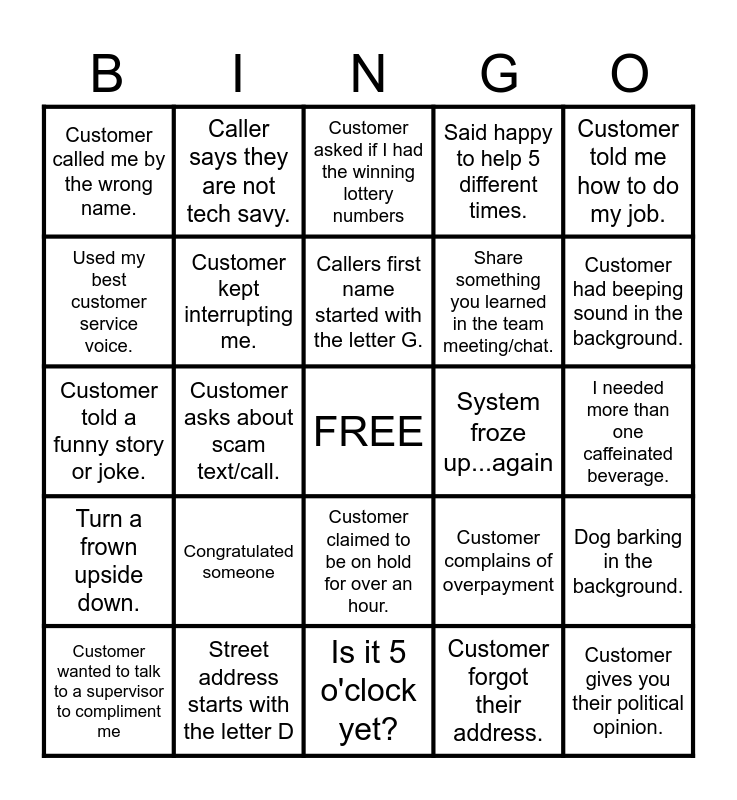 This bingo card has a free space and 24 words: Congratulated someone, Street address starts with the letter D, Callers first name started with the letter G., Customer wanted to talk to a supervisor to compliment me, Customer told me how to do my job., Customer called me by the wrong name., Used my best customer service voice., Caller says they are not tech savy., System froze up...again, Customer claimed to be on hold for over an hour., Share something you learned in the team meeting/chat., Customer told a funny story or joke., Customer complains of overpayment, Dog barking in the background., Customer kept interrupting me., Customer forgot their address., I needed more than one caffeinated beverage., Customer asked if I had the winning lottery numbers, Customer had beeping sound in the background., Customer asks about scam text/call., Customer gives you their political opinion., Turn a frown upside down., Said happy to help 5 different times. and Is it 5 o'clock yet?.