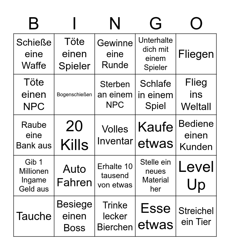 This bingo card has a free space and 24 words: Auto Fahren, Besiege einen Boss, Sterben an einem NPC, Tauche, Fliegen, Schieße eine Waffe, Töte einen NPC, Töte einen Spieler, Kaufe etwas, Erhalte 10 tausend von etwas, Schlafe in einem Spiel, Raube eine Bank aus, Stelle ein neues Material her, Level Up, Bogenschießen, Esse etwas, Bediene einen Kunden, Gewinne eine Runde, Flieg ins Weltall, 20 Kills, Streichel ein Tier, Gib 1 Millionen Ingame Geld aus, Unterhalte dich mit einem Spieler and Trinke lecker Bierchen.