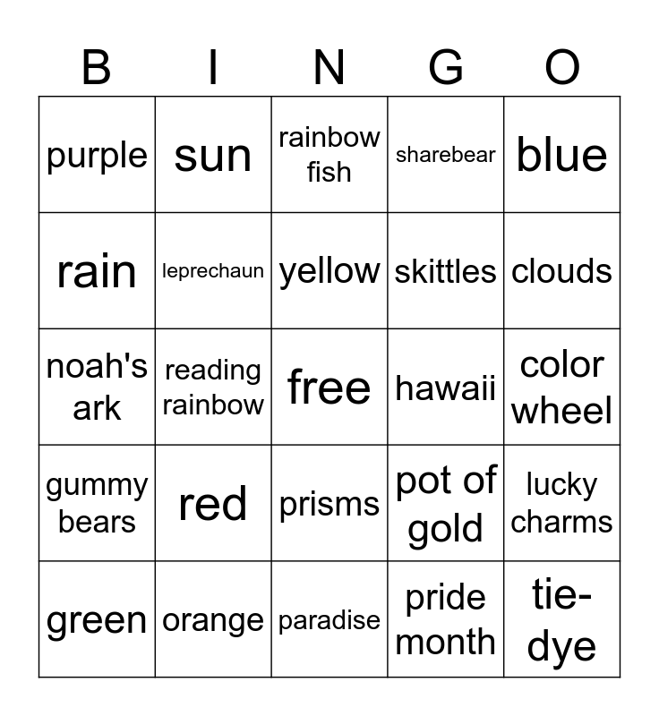 This bingo card has a free space and 24 words: red, orange, yellow, green, blue, purple, rain, sun, hawaii, prisms, skittles, noah's ark, pot of gold, lucky charms, leprechaun, pride month, color wheel, rainbow fish, clouds, reading rainbow, tie-dye, gummy bears, sharebear and paradise.
