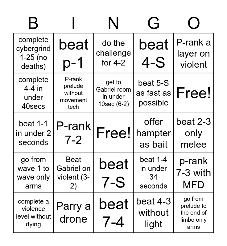 This bingo card has a free space and 24 words: Beat Gabriel on violent (3-2), Parry a drone, get to Gabriel room in under 10sec (6-2), complete a violence level without dying, P-rank a layer on violent, complete cybergrind 1-25 (no deaths), complete 4-4 in under 40secs, beat p-1, offer hampter as bait, beat 7-S, beat 5-S as fast as possible, beat 1-1 in under 2 seconds, beat 1-4 in under 34 seconds, p-rank 7-3 with MFD, P-rank prelude without movement tech, beat 4-3 without light, beat 2-3 only melee, do the challenge for 4-2, Free!, P-rank 7-2, go from prelude to the end of limbo only arms, go from wave 1 to wave only arms, beat 4-S and beat 7-4.