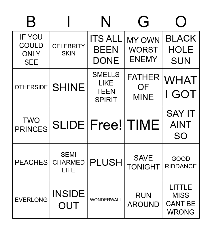 This bingo card has a free space and 24 words: SEMI CHARMED LIFE, INSIDE OUT, SMELLS LIKE TEEN SPIRIT, EVERLONG, BLACK HOLE SUN, IF YOU COULD ONLY SEE, OTHERSIDE, CELEBRITY SKIN, TIME, PLUSH, FATHER OF MINE, TWO PRINCES, SAVE TONIGHT, GOOD RIDDANCE, SHINE, RUN AROUND, SAY IT AINT SO, ITS ALL BEEN DONE, WHAT I GOT, SLIDE, LITTLE MISS CANT BE WRONG, PEACHES, MY OWN WORST ENEMY and WONDERWALL.