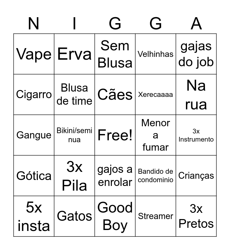 This bingo card has a free space and 24 words: 3x Pila, Gatos, Cães, 5x insta, gajas do job, Vape, Cigarro, Erva, Menor a fumar, gajos a enrolar, Xerecaaaa, Gangue, Bandido de condominio, Crianças, Blusa de time, Streamer, 3x Instrumento, Sem Blusa, Na rua, Bikini/semi nua, 3x Pretos, Gótica, Velhinhas and Good Boy.