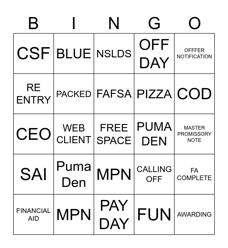 This bingo card has a free space and 24 words: Puma Den, MPN, FAFSA, FINANCIAL AID, OFFFER NOTIFICATION, CSF, RE ENTRY, BLUE, PUMA DEN, MPN, PIZZA, CEO, CALLING OFF, FA COMPLETE, PACKED, FUN, MASTER PROMISSORY NOTE, NSLDS, COD, WEB CLIENT, AWARDING, SAI, OFF DAY and PAY DAY.