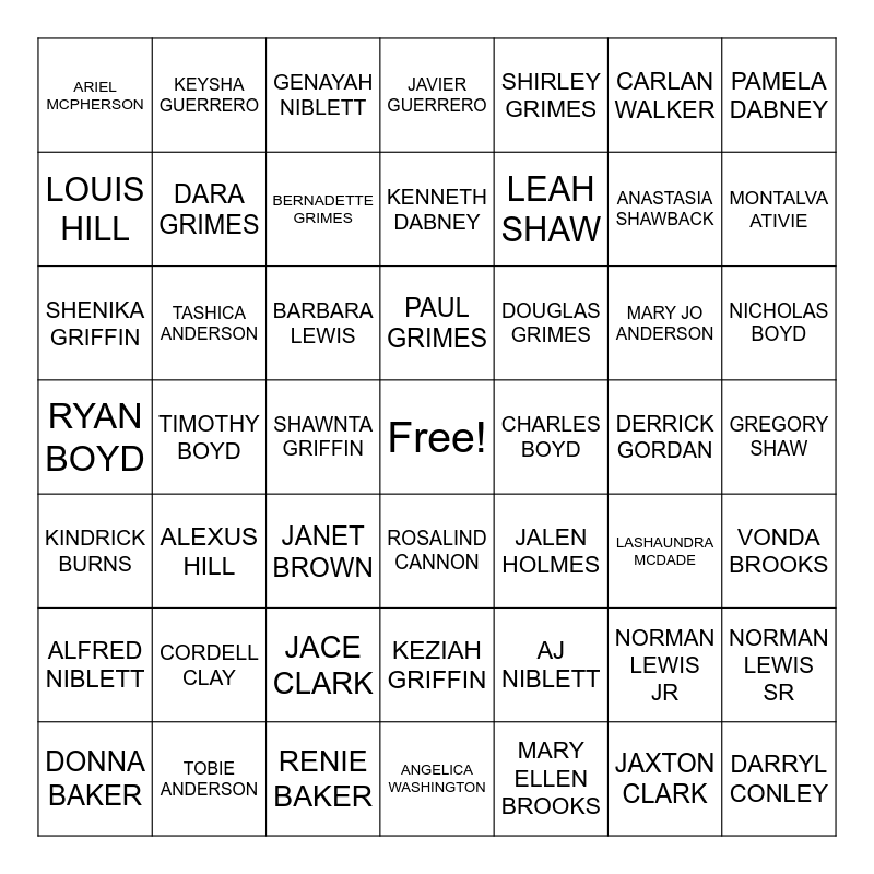 This bingo card has a free space and 75 words: JANET NIBLETT, ALFRED NIBLETT, GENAYAH NIBLETT, AJ NIBLETT, BRANDI NIBLETT, BRIANNA NIBLETT, LASHAUNDRA MCDADE, KEVANTE BARNES, JALEN HOLMES, RAVEN SNEED, DARRYL CONLEY, LASANDRA CONLEY, LOUIS HILL, CARLAN WALKER, MALLORY WAITES, LEAH SHAW, GREGORY SHAW, ANASTASIA SHAWBACK, CALVIN GRIMES, SHIRLEY GRIMES, ROSALIND CANNON, KENNETH DABNEY, PAMELA DABNEY, KEYSHA GUERRERO, JAVIER GUERRERO, ANGELICA WASHINGTON, DONNA BAKER, RENIE BAKER, CINDY GRIMES, BRANDY BROWN, JANET BROWN, WHITLEY BROWN, JORDAN BROWN, DOUGLAS GRIMES, BERNADETTE GRIMES, DARA GRIMES, WENDELL GRIMES, OLA GRIFFIN, SHENIKA GRIFFIN, SHAWNTA GRIFFIN, KEZIAH GRIFFIN, JACE CLARK, JAXTON CLARK, SAMANTHA GRIFFIN, EVELYN BOYD, CHARLES BOYD, NICHOLAS BOYD, ARIEL MCPHERSON, MICHELLE MCPHERSON, YOLANDA GORDAN, DERRICK GORDAN, PAUL GRIMES, KAREN SINGLETON, VONDA BROOKS, MARY ELLEN BROOKS, LEROY ANDERSON III, KINDRICK BURNS, NORMAN LEWIS JR, DIONNE LEWIS, NORMAN LEWIS SR, BARBARA LEWIS, LANDON LEWIS, DEALON LEWIS, MELVIN GRIMES, CORDELL CLAY, MONTALVA ATIVIE, ALEXUS HILL, KORY WELCH, TOBIE ANDERSON, MARY JO ANDERSON, TASHICA ANDERSON, RYAN BOYD, EMILY BOYD, TIMOTHY BOYD and DAPHNE BOYD.