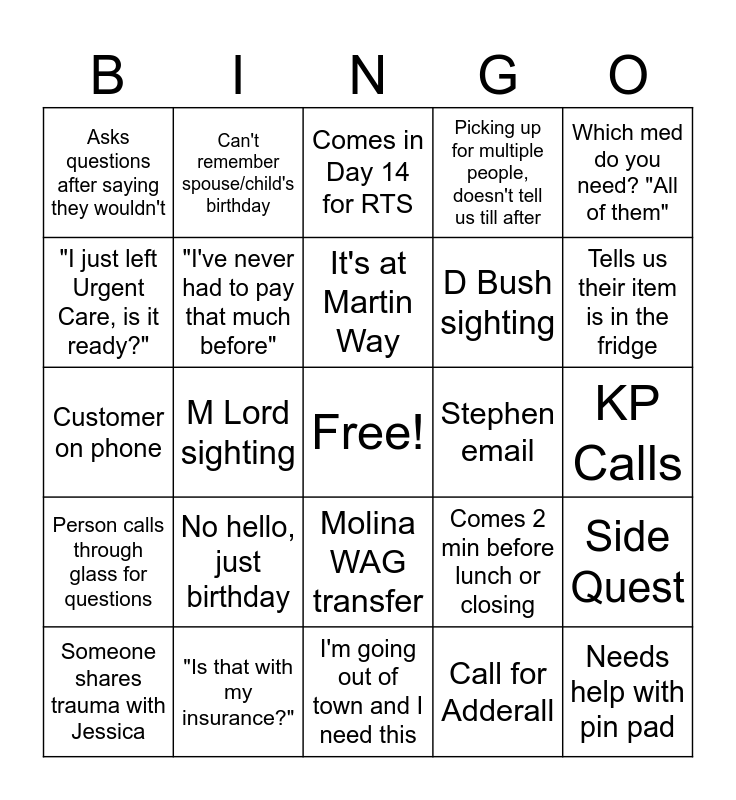 This bingo card has a free space and 24 words: No hello, just birthday, "Is that with my insurance?", It's at Martin Way, Someone shares trauma with Jessica, Which med do you need? "All of them", Asks questions after saying they wouldn't, "I just left Urgent Care, is it ready?", Can't remember spouse/child's birthday, Stephen email, Molina WAG transfer, D Bush sighting, Customer on phone, Comes 2 min before lunch or closing, Side Quest, "I've never had to pay that much before", Call for Adderall, KP Calls, Comes in Day 14 for RTS, Tells us their item is in the fridge, M Lord sighting, Needs help with pin pad, Person calls through glass for questions, Picking up for multiple people, doesn't tell us till after and I'm going out of town and I need this.