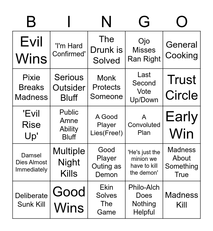 This bingo card has a free space and 24 words: Multiple Night Kills, Good Wins, Monk Protects Someone, Deliberate Sunk Kill, General Cooking, Evil Wins, Pixie Breaks Madness, 'I'm Hard Confirmed', A Convoluted Plan, Good Player Outing as Demon, Last Second Vote Up/Down, 'Evil Rise Up', 'He's just the minion we have to kill the demon', Madness About Something True, Serious Outsider Bluff, Philo-Alch Does Nothing Helpful, Early Win, The Drunk is Solved, Trust Circle, Public Amne Ability Bluff, Madness Kill, Damsel Dies Almost Immediately, Ojo Misses Ran Right and Ekin Solves The Game.