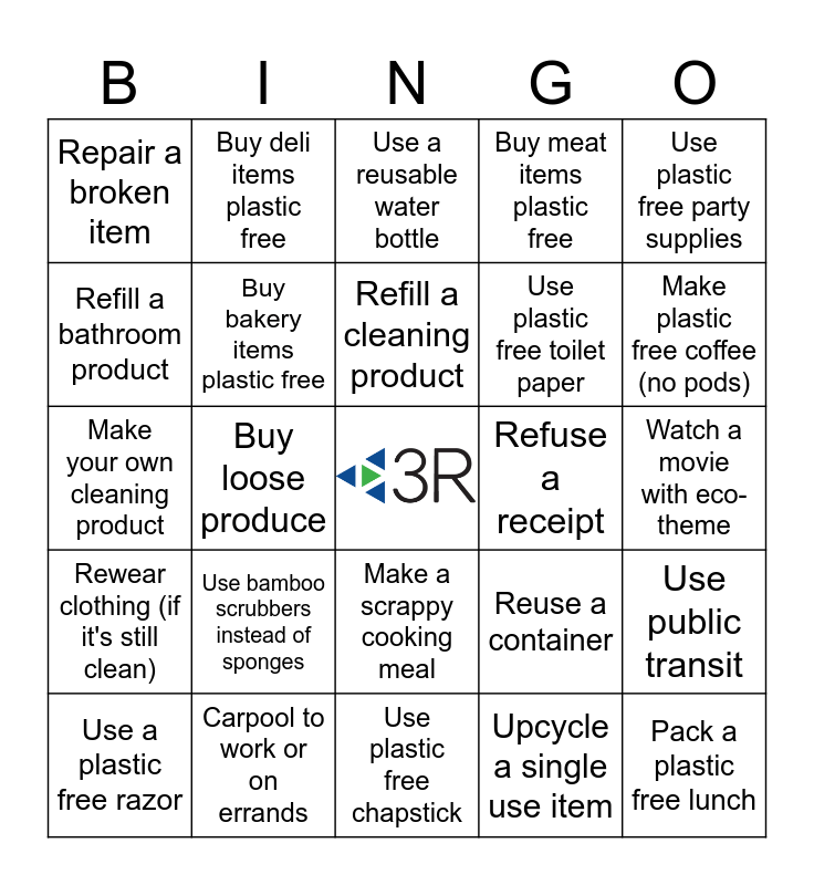 This bingo card has a free space and 75 words: Go 1 day without buying anything, Use a reusable straw, Use a reusable water bottle, Eat meatless meals for 1 day, Bring your own Coffee cup, Refuse a plastic bag, Use a reusable produce bag, Use a reusable grocery bag, Reuse a jar, Shop secondhand, Bike or walk to work, Bike or walk for an errand, Refill a cleaning product, Refill a bathroom product, Buy a grocery item in bulk, Buy loose produce, Shop at your farmer's market, Pack a plastic free lunch, Air dry your clothes, Use plastic free party supplies, Use a reusable container for take-out, Make your own cleaning product, Buy bakery items plastic free, Buy deli items plastic free, Buy meat items plastic free, Pick up 5 pieces of trash, Swap out plastic cling wrap, Swap out plastic snack bags, Refuse plastic utensils, Bring your own utensils, Swap to bar soap, Swap to bar shampoo, Swap to bar conditioner, Reuse a container, Make plastic free coffee (no pods), Use plastic free toilet paper, Replace plastic bag liners (garbage bags), Read a book with eco-theme, Watch a movie with eco-theme, Upcycle a single use item, Make plastic free tea (no bags), Use reusable plates at a party, Use reusable utensils at a party, Refuse a plastic straw, Do plastic free laundry (no pods), Make the Plastic Free July Pledge, Use a plastic free razor, Repair a broken item, Mend your own clothes, Floss your teeth with no plastic, Swap paper towels for reusables, Make a scrappy cooking meal, Swap to plastic packaging free toilet paper, Swap tissues for reusables, Visit a refill store, Give a plastic free gift, Attend a clothing swap, Research local policies on waste, Choose glass for milk or juice, Tell a friend about Plastic Free July, Use bamboo scrubbers instead of sponges, Plant pollinator friendly plants, Plant native plants, Recycle, Compost food scraps, Refuse a receipt, Check out a book from your library, Reuse gift bags/packaging, Refuse a product with excessive packaging, Use public transit, Rewear clothing (if it's still clean), Carpool to work or on errands, Harvest rain water (if legal in your state), Use plastic free chapstick and Research your waste hauler's plastic protocols.