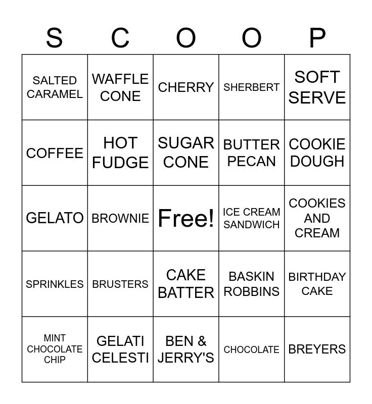 This bingo card has a free space and 34 words: VANILLA, CHOCOLATE, STRAWBERRY, MILKSHAKES, SPRINKLES, HOT FUDGE, SOFT SERVE, MINT CHOCOLATE CHIP, WAFFLE CONE, ICE CREAM SUNDAE, SUGAR CONE, CHERRY, ICE CREAM TRUCK, WHIPPED CREAM, ICE CREAM SANDWICH, COOKIE DOUGH, GELATI CELESTI, GELATO, BRUSTERS, BASKIN ROBBINS, CAKE BATTER, ROCKY ROAD, SALTED CARAMEL, COOKIES AND CREAM, BEN & JERRY'S, BREYERS, SHERBERT, SCOOP, BUTTER PECAN, COFFEE, MOOSE TRACKS, BROWNIE, BIRTHDAY CAKE and BUTTERSCOTCH.