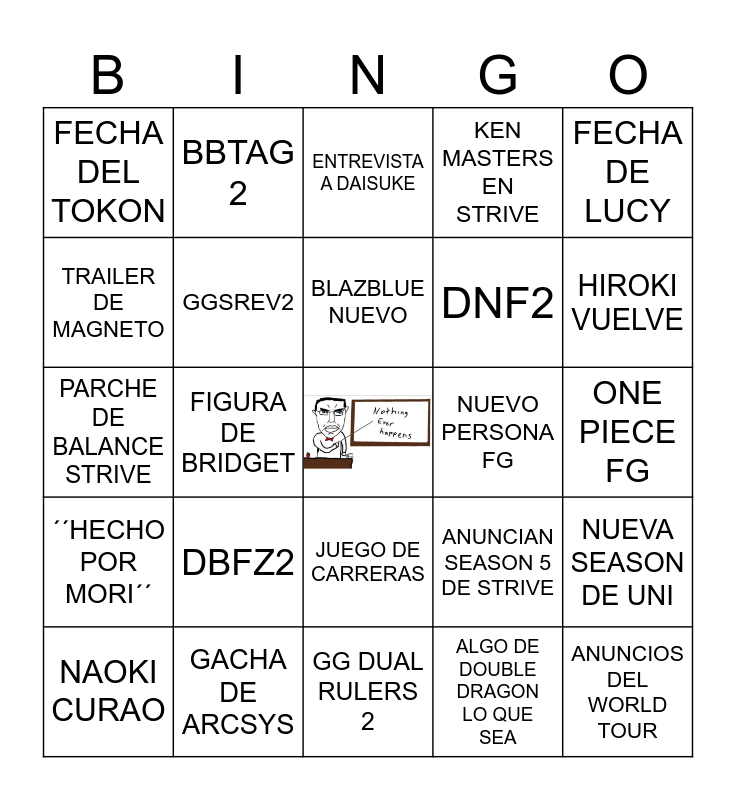 This bingo card has a free space and 24 words: DBFZ2, GACHA DE ARCSYS, BLAZBLUE NUEVO, NAOKI CURAO, FECHA DE LUCY, FECHA DEL TOKON, TRAILER DE MAGNETO, BBTAG 2, NUEVO PERSONA FG, JUEGO DE CARRERAS, DNF2, PARCHE DE BALANCE STRIVE, ANUNCIAN SEASON 5 DE STRIVE, NUEVA SEASON DE UNI, GGSREV2, ALGO DE DOUBLE DRAGON LO QUE SEA, ONE PIECE FG, ENTREVISTA A DAISUKE, HIROKI VUELVE, FIGURA DE BRIDGET, ANUNCIOS DEL WORLD TOUR, ´´HECHO POR MORI´´, KEN MASTERS EN STRIVE and GG DUAL RULERS 2.