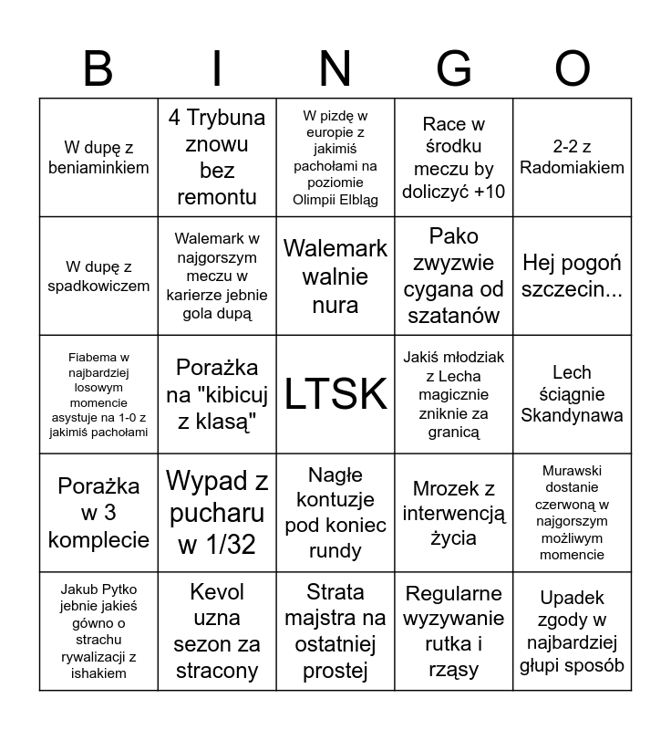 This bingo card has a free space and 24 words: Wypad z pucharu w 1/32, Kevol uzna sezon za stracony, Walemark walnie nura, Jakub Pytko jebnie jakieś gówno o strachu rywalizacji z ishakiem, 2-2 z Radomiakiem, W dupę z beniaminkiem, W dupę z spadkowiczem, 4 Trybuna znowu bez remontu, Jakiś młodziak z Lecha magicznie zniknie za granicą, Nagłe kontuzje pod koniec rundy, Pako zwyzwie cygana od szatanów, Fiabema w najbardziej losowym momencie asystuje na 1-0 z jakimiś pachołami, Mrozek z interwencją życia, Murawski dostanie czerwoną w najgorszym możliwym momencie, Walemark w najgorszym meczu w karierze jebnie gola dupą, Regularne wyzywanie rutka i rząsy, Lech ściągnie Skandynawa, W pizdę w europie z jakimiś pachołami na poziomie Olimpii Elbląg, Hej pogoń szczecin..., Porażka na "kibicuj z klasą", Upadek zgody w najbardziej głupi sposób, Porażka w 3 komplecie, Race w środku meczu by doliczyć +10 and Strata majstra na ostatniej prostej.