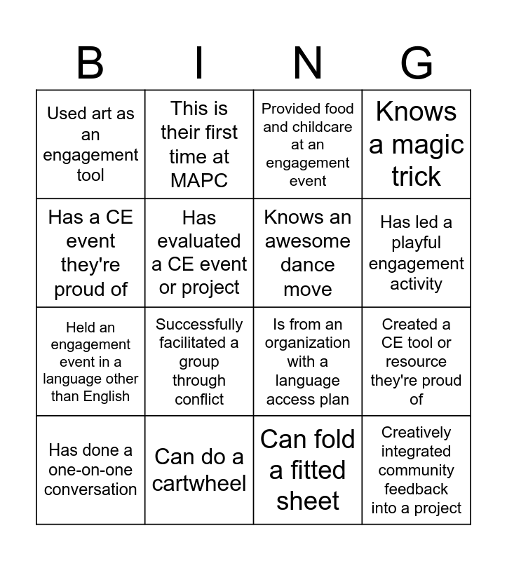This bingo card has 16 words: Can do a cartwheel, Created a CE tool or resource they're proud of, Provided food and childcare at an engagement event, Used art as an engagement tool, Held an engagement event in a language other than English, This is their first time at MAPC, Is from an organization with a language access plan, Can fold a fitted sheet, Has a CE event they're proud of, Has evaluated a CE event or project, Has done a one-on-one conversation, Knows a magic trick, Successfully facilitated a group through conflict, Has led a playful engagement activity, Knows an awesome dance move and Creatively integrated community feedback into a project.