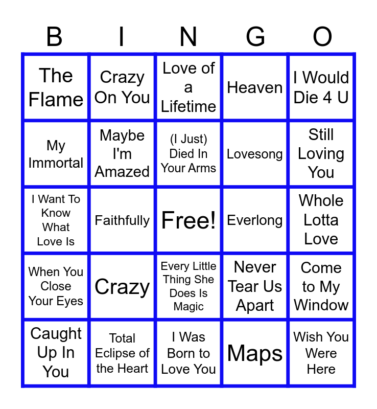This bingo card has a free space and 24 words: Crazy, Total Eclipse of the Heart, (I Just) Died In Your Arms, Caught Up In You, I Would Die 4 U, The Flame, My Immortal, Crazy On You, Everlong, Every Little Thing She Does Is Magic, Lovesong, I Want To Know What Love Is, Never Tear Us Apart, Come to My Window, Maybe I'm Amazed, Maps, Whole Lotta Love, Love of a Lifetime, Still Loving You, Faithfully, Wish You Were Here, When You Close Your Eyes, Heaven and I Was Born to Love You.