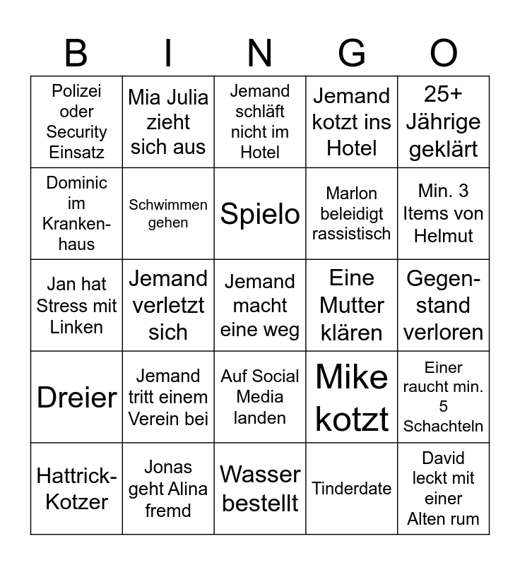 This bingo card has a free space and 24 words: Hattrick-Kotzer, Jemand tritt einem Verein bei, Spielo, Tinderdate, 25+ Jährige geklärt, Polizei oder Security Einsatz, Mia Julia zieht sich aus, Jemand schläft nicht im Hotel, Eine Mutter klären, Gegen-stand verloren, Jan hat Stress mit Linken, Schwimmen gehen, Mike kotzt, Einer raucht min. 5 Schachteln, Dominic im Kranken-haus, Jonas geht Alina fremd, Wasser bestellt, Jemand kotzt ins Hotel, Min. 3 Items von Helmut, Dreier, Jemand verletzt sich, Auf Social Media landen, Marlon beleidigt rassistisch and David leckt mit einer Alten rum.
