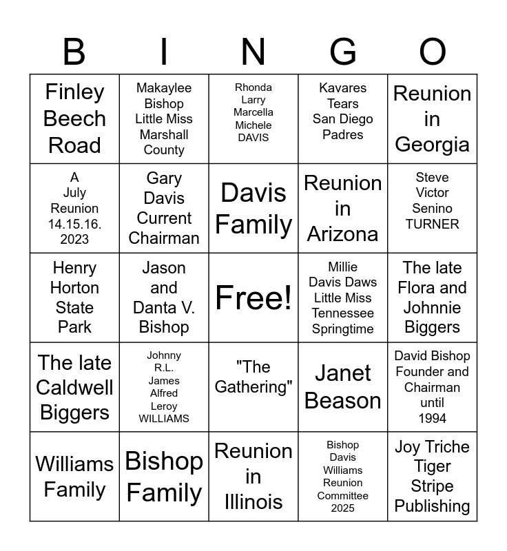 This bingo card has a free space and 24 words: Johnny R.L. James Alfred Leroy WILLIAMS, Bishop Family, Davis Family, Williams Family, Reunion in Georgia, Finley Beech Road, A July Reunion 14.15.16. 2023, Makaylee Bishop Little Miss Marshall County, Millie Davis Daws Little Miss Tennessee Springtime, "The Gathering", Reunion in Arizona, Henry Horton State Park, Janet Beason, David Bishop Founder and Chairman until 1994, Gary Davis Current Chairman, Bishop Davis Williams Reunion Committee 2025, The late Flora and Johnnie Biggers, Rhonda Larry Marcella Michele DAVIS, Steve Victor Senino TURNER, Jason and Danta V. Bishop, Joy Triche Tiger Stripe Publishing, The late Caldwell Biggers, Kavares Tears San Diego Padres and Reunion in Illinois.