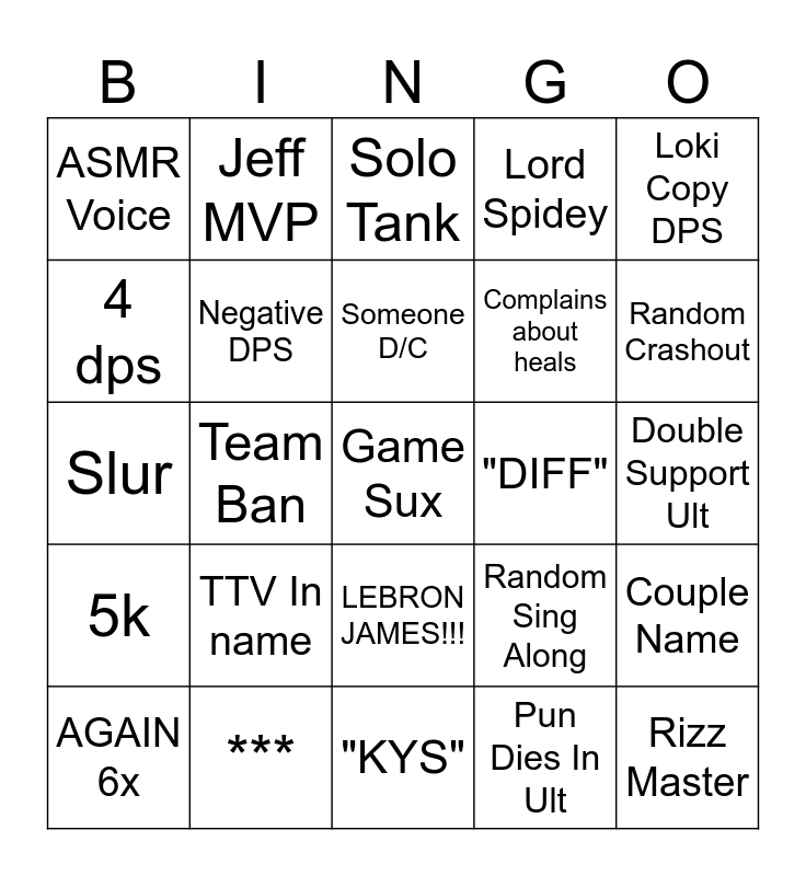 This bingo card has a free space and 24 words: TTV In name, ***, Someone D/C, AGAIN 6x, Loki Copy DPS, ASMR Voice, 4 dps, Jeff MVP, "DIFF", LEBRON JAMES!!!, Complains about heals, Slur, Random Sing Along, Couple Name, Negative DPS, Pun Dies In Ult, Double Support Ult, Solo Tank, Random Crashout, Team Ban, Rizz Master, 5k, Lord Spidey and "KYS".