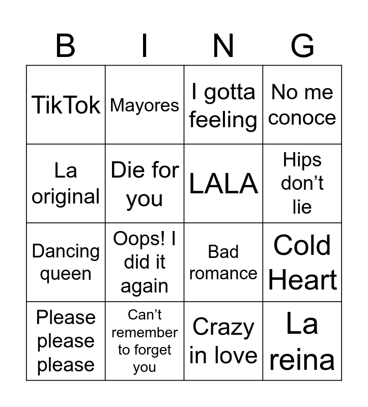 This bingo card has 33 words: Free!, Yo perreo sola, Cold Heart, Gimme Gimme Gimme, La reina, LALA, La original, Vamos a la playa, Mayores, Circus, Hips don’t lie, I gotta feeling, Only girl, Promiscuous, Can’t remember to forget you, Oops! I did it again, Summer, Bad romance, Toxic, I love it, Talk dirty, Hotel room service, TikTok, Crazy in love, Si antes de hubiera conocido, Please please please, No me conoce, Dancing queen, Die for you, Zorra, El tonto, La bicicleta and Loca.