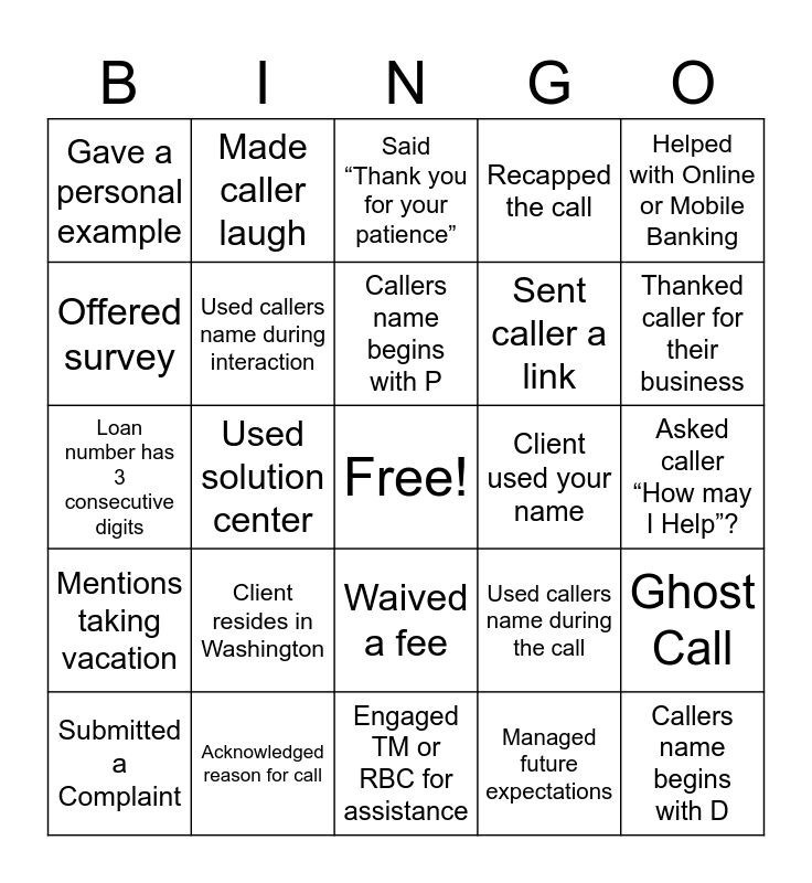 This bingo card has a free space and 25 words: Client resides in Washington, Engaged TM or RBC for assistance, Callers name begins with P, Submitted a Complaint, Helped with Online or Mobile Banking, Gave a personal example, Offered survey, Made caller laugh, Client used your name, Waived a fee, Sent caller a link, Loan number has 3 consecutive digits, Used callers name during the call, Ghost Call, Used callers name during interaction, Demonstrated Empathy, Asked caller “How may I Help”?, Said “Thank you for your patience”, Thanked caller for their business, Used solution center, Callers name begins with D, Acknowledged reason for call, Mentions taking vacation, Recapped the call and Managed future expectations.