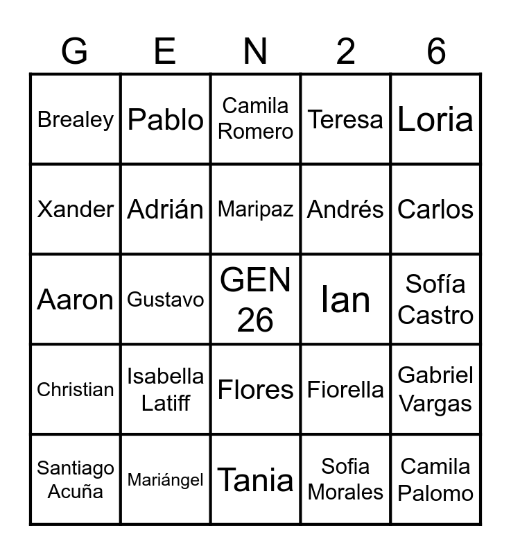 This bingo card has a free space and 57 words: Reinaldo, Santiago Acuña, Mariana Avendaño, Brealey, Tania, Luis, Adrián, Campos, Andrés, Paula Castro, Teresa, Valeria, Andrey, Aimara, Stephanie, Samantha, Loria, Gustavo, Camila Morales, Camila Palomo, Ian, Derek, Fiorella, Camila Romero, Julián, Maripaz, Ana Laura, Nathalie, Carlos, Angélica, Allison, José María, Fabiana, Karina, Sofía Castro, Xander, Helena, Aaron, Ignacio, Christian, Pablo, Flores, Monserrat, David, Isaac, Luciano, Isabella Latiff, Mariángel, Victoria, Néstor, Ester, Sofia Morales, Thais, Mariana Sánchez, Mauricio, Gabriel Vargas and Sofía Vásquez.