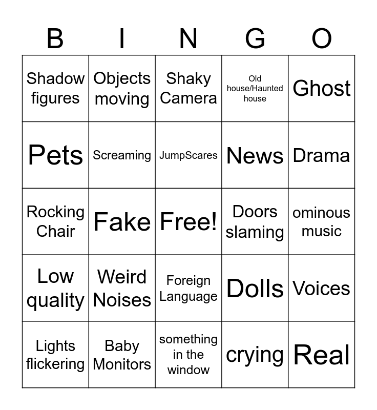 This bingo card has a free space and 24 words: Weird Noises, Baby Monitors, JumpScares, Lights flickering, Ghost, Shadow figures, Pets, Objects moving, Doors slaming, Foreign Language, News, Rocking Chair, Dolls, Voices, Screaming, crying, ominous music, Shaky Camera, Drama, Fake, Real, Low quality, Old house/Haunted house and something in the window.