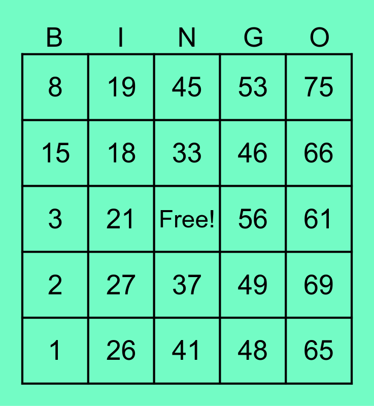 This bingo card has a free space and 24 words: 1, 27, 33, 48, 75, 8, 19, 45, 56, 61, 3, 18, 49, 69, 15, 26, 41, 53, 66, 2, 21, 37, 46 and 65.