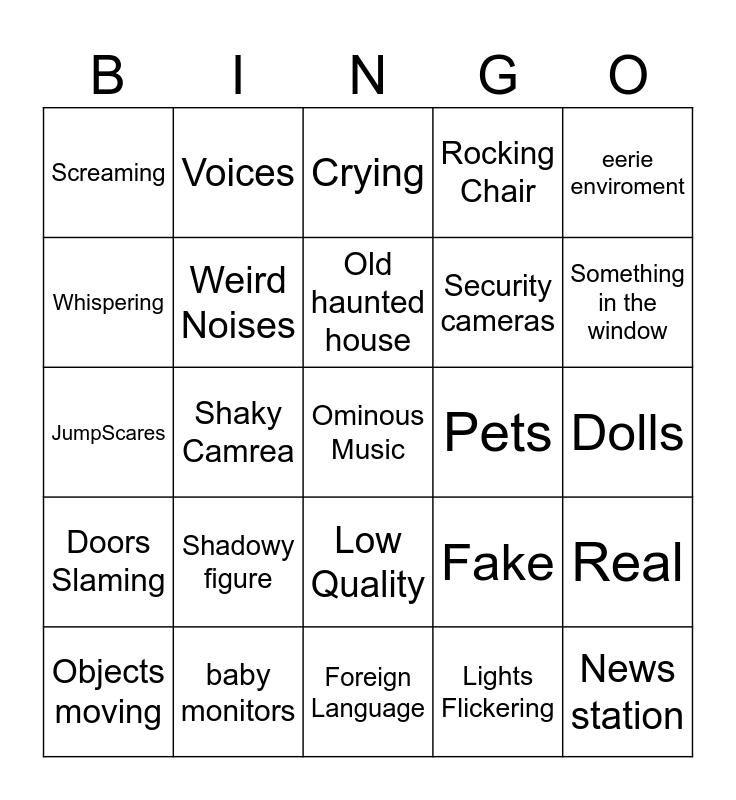 This bingo card has a free space and 24 words: Shadowy figure, baby monitors, Old haunted house, Objects moving, eerie enviroment, Screaming, Whispering, Voices, Pets, Low Quality, Security cameras, JumpScares, Fake, Real, Weird Noises, Lights Flickering, Dolls, Crying, Something in the window, Shaky Camrea, News station, Doors Slaming, Rocking Chair and Foreign Language.