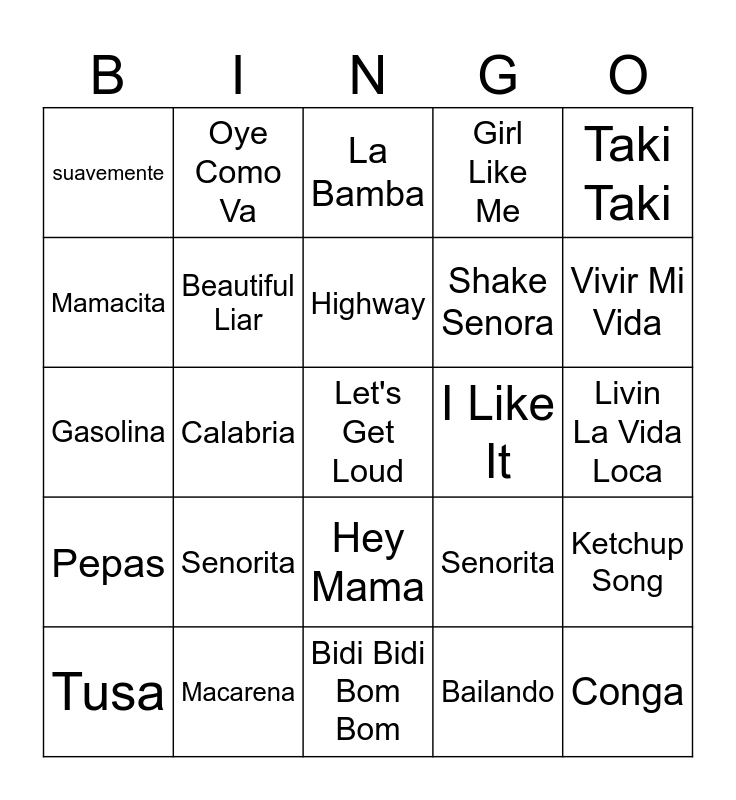 This bingo card has 35 words: Bang Bang, MIA, Party, Beautiful Liar, Hey Mama, Girl Like Me, Mamacita, Havana, Highway, Play Bad Bunny, Gasolina, Taki Taki, One Dance, South Of The Border, suavemente, I Like It, Bailando, Calabria, Pepas, Let's Get Loud, Senorita, Tusa, Ketchup Song, Macarena, La Bamba, Vivir Mi Vida, Conga, The Anthem, Shake Senora, Livin La Vida Loca, Cup Of Life, Bidi Bidi Bom Bom, Senorita, Oye Como Va and Fireball.