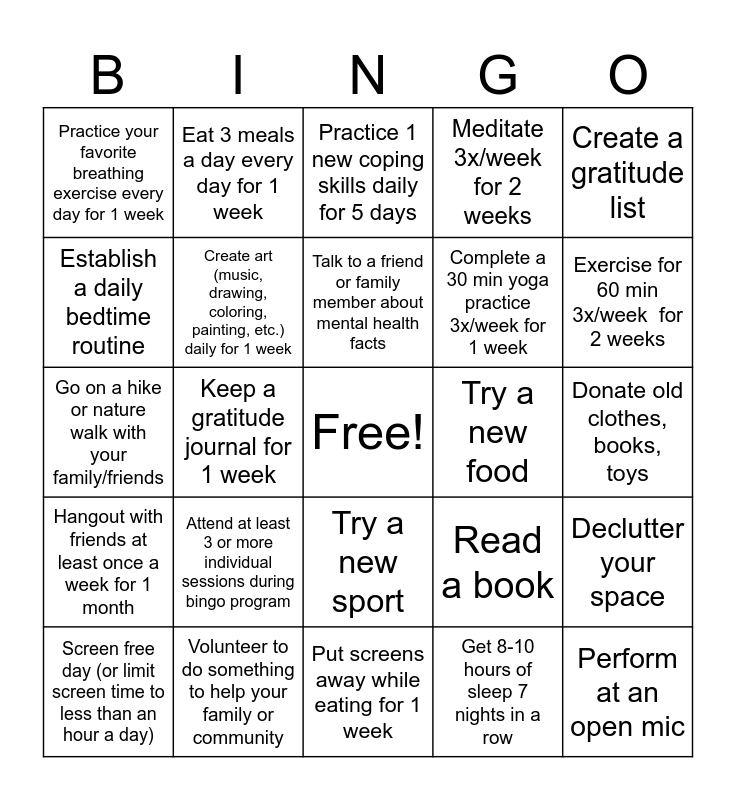 This bingo card has a free space and 24 words: Attend at least 3 or more individual sessions during bingo program, Volunteer to do something to help your family or community, Talk to a friend or family member about mental health facts, Screen free day (or limit screen time to less than an hour a day), Create a gratitude list, Practice your favorite breathing exercise every day for 1 week, Establish a daily bedtime routine, Eat 3 meals a day every day for 1 week, Try a new food, Try a new sport, Complete a 30 min yoga practice 3x/week for 1 week, Go on a hike or nature walk with your family/friends, Read a book, Declutter your space, Create art (music, drawing, coloring, painting, etc.) daily for 1 week, Get 8-10 hours of sleep 7 nights in a row, Donate old clothes, books, toys, Practice 1 new coping skills daily for 5 days, Exercise for 60 min 3x/week for 2 weeks, Keep a gratitude journal for 1 week, Perform at an open mic, Hangout with friends at least once a week for 1 month, Meditate 3x/week for 2 weeks and Put screens away while eating for 1 week.