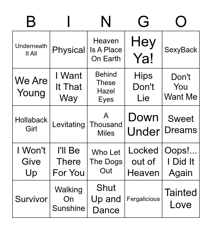 This bingo card has a free space and 39 words: The Twist, Don't You (Forget About Me), Wake Me Up Before You Go-Go, I Want It That Way, Survivor, Who Let The Dogs Out, Behind These Hazel Eyes, Paparazzi, SexyBack, I Won't Give Up, Levitating, Hey Ya!, Tainted Love, Sweet Dreams, Down Under, I'll Be There For You, Baby, Baby, Underneath It All, Crush, Locked out of Heaven, We Are Young, Shut Up and Dance, Hips Don't Lie, Don't You Want Me, California Dreamin', God Only Knows, Cake By The Ocean, This Love, Hey Mickey, Physical, STAY, Uptown Girl, Heaven Is A Place On Earth, Walking On Sunshine, Fergalicious, Dynamite, Oops!... I Did It Again, Hollaback Girl and Beautiful Soul.