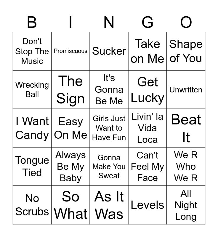 This bingo card has a free space and 39 words: I Want You Back, Never Gonna Give You Up, What's Love Got to Do with It, The Sign, No Scrubs, Gonna Make You Sweat, It's Gonna Be Me, Bad Romance, Shape of You, Tongue Tied, Easy On Me, Take on Me, All Night Long, Beat It, Livin' la Vida Loca, Always Be My Baby, What a Girl Wants, Don't Stop The Music, My Happy Ending, Can't Feel My Face, Wrecking Ball, As It Was, Get Lucky, Unwritten, Call Me Maybe, Lover, Closer, We Got The Beat, What I Like About You, Promiscuous, I Melt With You, Bennie And The Jets, Sucker, So What, Levels, Torn, We R Who We R, I Want Candy and Dark Horse.