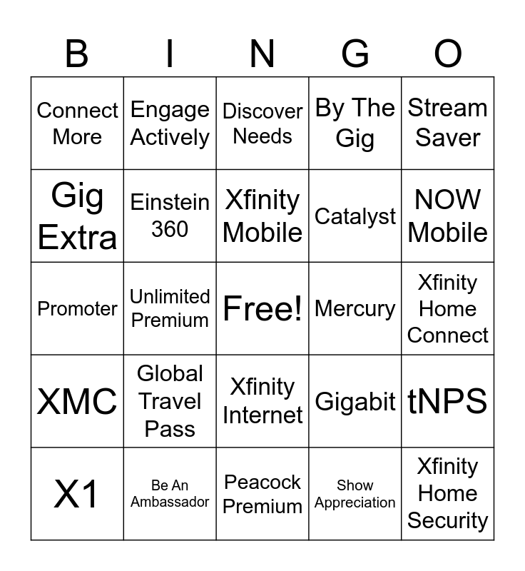 This bingo card has a free space and 39 words: Next Gen, CSG, XOE, Einstein 360, X1, Xfinity Internet, Xfinity Mobile, xFi Complete, Stream Saver, XMC, Unlimited Premium, By The Gig, Xfinity Home Security, Xfinity Home Connect, Mercury, Global Travel Pass, 5-Year Price Guarantee, Connect More, Fast, Gigabit, Gig Extra, Peacock Premium, Catalyst, NOW Mobile, NOW Internet, NOW TV, Elite Upgrade, Xfinity Rewards, XUMO, Engage Actively, Own It, Make It Effortless, Discover Needs, Be An Ambassador, Show Appreciation, Chat, tNPS, Promoter and Detractor.