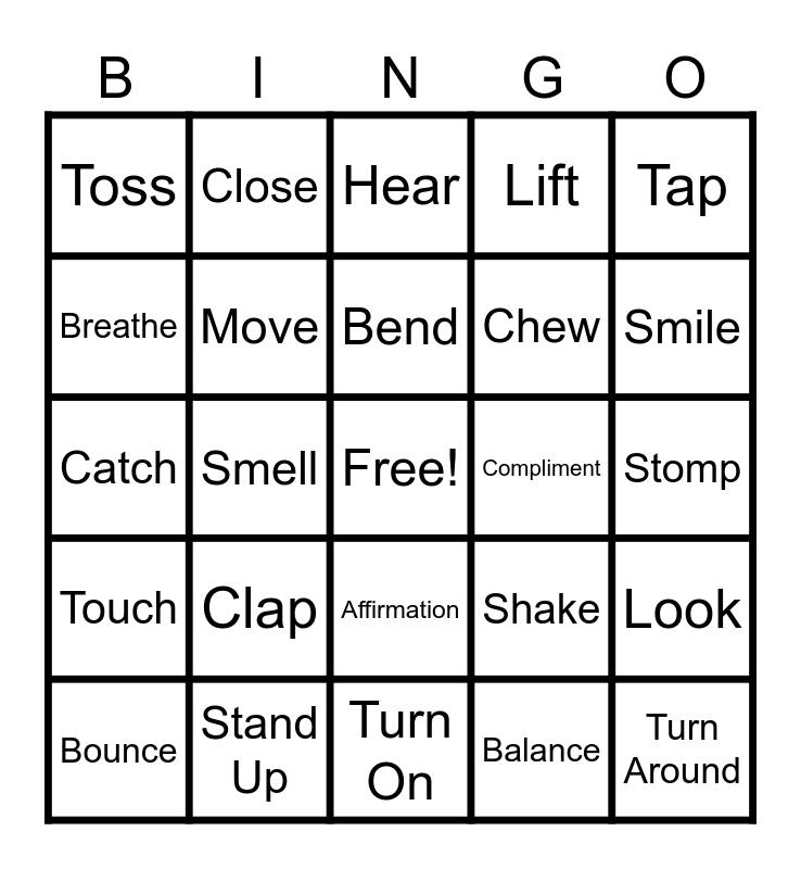 This bingo card has a free space and 29 words: Bounce, Squeeze, Smell, Taste, Toss, Hear, Move, Clap, Compliment, Stand Up, Stomp, Turn Around, Turn On, Balance, Smile, Say, Affirmation, Touch, Tap, Catch, Shake, Describe, Chew, Breathe, Lift, Close, Look, Bend and Hum.