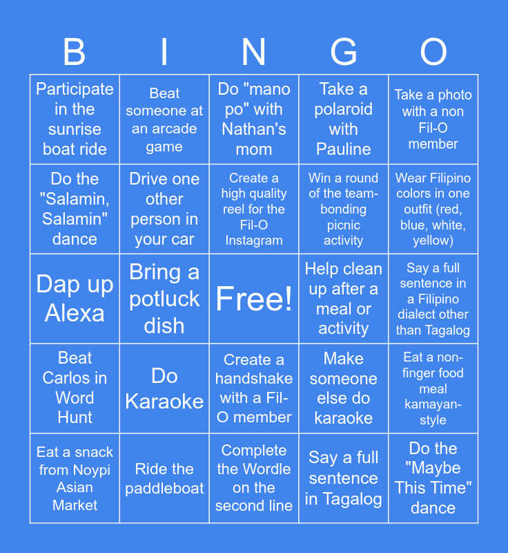 This bingo card has a free space and 24 words: Eat a snack from Noypi Asian Market, Do Karaoke, Create a high quality reel for the Fil-O Instagram, Say a full sentence in Tagalog, Take a photo with a non Fil-O member, Participate in the sunrise boat ride, Beat someone at an arcade game, Do "mano po" with Nathan's mom, Help clean up after a meal or activity, Say a full sentence in a Filipino dialect other than Tagalog, Dap up Alexa, Drive one other person in your car, Make someone else do karaoke, Eat a non-finger food meal kamayan-style, Do the "Salamin, Salamin" dance, Ride the paddleboat, Complete the Wordle on the second line, Take a polaroid with Pauline, Wear Filipino colors in one outfit (red, blue, white, yellow), Beat Carlos in Word Hunt, Bring a potluck dish, Create a handshake with a Fil-O member, Win a round of the team-bonding picnic activity and Do the "Maybe This Time" dance.