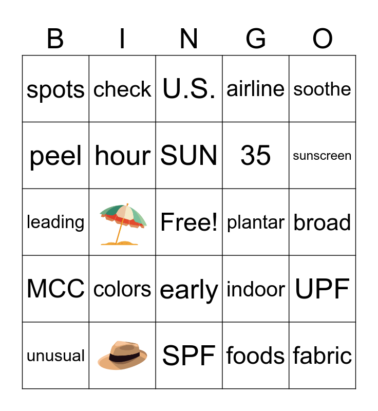 This bingo card has 4 images, a free space and 26 words: spots, U.S., hour, early, plantar, SPF, broad, fabric, foods, red, sunscreen, Marley, indoor, MCC, colors, soothe, leading, window, check, 35, peel, airline, UPF, unusual, SUN and 70.