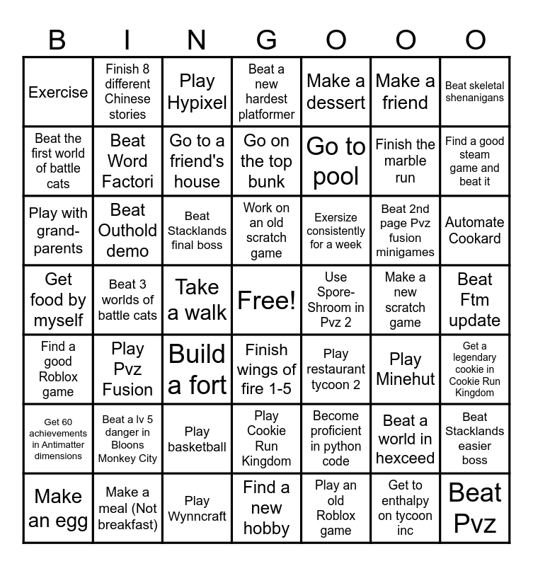 This bingo card has a free space and 48 words: Become proficient in python code, Finish the marble run, Find a new hobby, Beat 3 worlds of battle cats, Beat Stacklands final boss, Beat Ftm update, Finish 8 different Chinese stories, Make a meal (Not breakfast), Make a friend, Finish wings of fire 1-5, Beat skeletal shenanigans, Beat a new hardest platformer, Beat 2nd page Pvz fusion minigames, Exersize consistently for a week, Get 60 achievements in Antimatter dimensions, Make a new scratch game, Beat the first world of battle cats, Find a good steam game and beat it, Beat a world in hexceed, Make a dessert, Go to pool, Take a walk, Exercise, Beat Word Factori, Beat Stacklands easier boss, Go to a friend's house, Automate Cookard, Make an egg, Work on an old scratch game, Beat Outhold demo, Get to enthalpy on tycoon inc, Use Spore-Shroom in Pvz 2, Get a legendary cookie in Cookie Run Kingdom, Beat a lv 5 danger in Bloons Monkey City, Get food by myself, Play restaurant tycoon 2, Play Minehut, Play with grand-parents, Build a fort, Play basketball, Find a good Roblox game, Beat Pvz, Play Hypixel, Play Wynncraft, Go on the top bunk, Play Cookie Run Kingdom, Play Pvz Fusion and Play an old Roblox game.