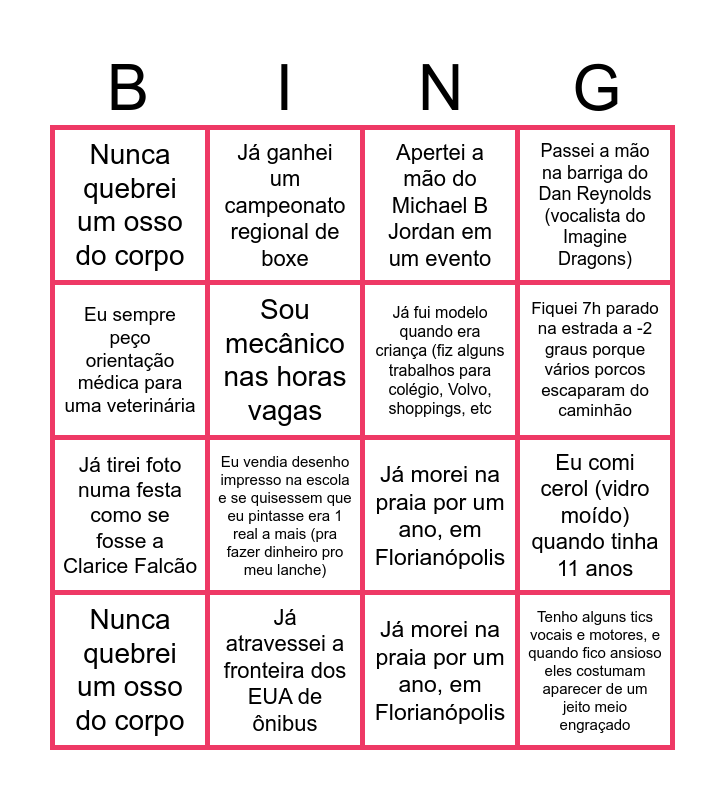This bingo card has 1 images and 72 words: Tenho CNH e não sei dirigir, Nunca quebrei um osso do corpo, Já fui expulso de uma balada em Las Vegas, Fui vice campeão mundial em um esporte, Eu já quase morri afogado em uma enchente quando tinha 13 anos, Tenho alguns tics vocais e motores, e quando fico ansioso eles costumam aparecer de um jeito meio engraçado, A cidade que eu moro é conhecida como a cidade do cacau, Eu sei tirar leite de vaca, Já tirei foto numa festa como se fosse a Clarice Falcão, Apertei a mão do Michael B Jordan em um evento, Lancei um curso digital e tive 25 alunos, Já fui modelo quando era criança (fiz alguns trabalhos para colégio, Volvo, shoppings, etc, Já morei na praia por um ano, em Florianópolis, Tenho muito interesse por investimentos em ações e fundos imobiliários, Já ganhei um campeonato regional de boxe, Já dei aula de capoeira infantil, Sou mecânico nas horas vagas, Eu consigo dobrar só as pontas dos dedos, Já atravessei a fronteira dos EUA de ônibus, Fiquei 7h parado na estrada a -2 graus porque vários porcos escaparam do caminhão, Passei a mão na barriga do Dan Reynolds (vocalista do Imagine Dragons), Eu sempre peço orientação médica para uma veterinária, Já caiu metade do forro de um quarto na minha cabeça, Sou um grande fã de escolas de samba e defendo enredos com unhas e dentes, Já dormi pelado na sacada depois de chegar bêbado em casa, Já quebrei o pé correndo para pegar o ônibus, Eu vendia desenho impresso na escola e se quisessem que eu pintasse era 1 real a mais (pra fazer dinheiro pro meu lanche), Eu tenho uma mania esquisita de cheirar todas as coisas antes de comer, Já me apresentei na escola com meus amigos, fui o vocalista do grupo de pagode que formamos, Assisti um jogo de copa do mundo do Brasil no país adversário com 100 mil torcedores contra, Já perdi um voo que seria 00:30, pois fui pro aeroporto só no dia seguinte, Toquei trompete por mais de 10 anos e abri até o show do Gilberto Gil, A minha primeira ida ao motel foi com a minha mãe, Eu comi cerol (vidro moído) quando tinha 11 anos, Amo fazer pinturas de cristais, Cuidar de plantinhas é minha terapia, Tenho CNH e não sei dirigir, Nunca quebrei um osso do corpo, Já fui expulso de uma balada em Las Vegas, Fui vice campeão mundial em um esporte, Eu já quase morri afogado em uma enchente quando tinha 13 anos, Tenho alguns tics vocais e motores, e quando fico ansioso eles costumam aparecer de um jeito meio engraçado, A cidade que eu moro é conhecida como a cidade do cacau, Eu sei tirar leite de vaca, Já tirei foto numa festa como se fosse a Clarice Falcão, Apertei a mão do Michael B Jordan em um evento, Lancei um curso digital e tive 25 alunos, Já fui modelo quando era criança (fiz alguns trabalhos para colégio, Volvo, shoppings, etc, Já morei na praia por um ano, em Florianópolis, Tenho muito interesse por investimentos em ações e fundos imobiliários, Já ganhei um campeonato regional de boxe, Já dei aula de capoeira infantil, Sou mecânico nas horas vagas, Eu consigo dobrar só as pontas dos dedos, Já atravessei a fronteira dos EUA de ônibus, Fiquei 7h parado na estrada a -2 graus porque vários porcos escaparam do caminhão, Passei a mão na barriga do Dan Reynolds (vocalista do Imagine Dragons), Eu sempre peço orientação médica para uma veterinária, Já caiu metade do forro de um quarto na minha cabeça, Sou um grande fã de escolas de samba e defendo enredos com unhas e dentes, Já dormi pelado na sacada depois de chegar bêbado em casa, Já quebrei o pé correndo para pegar o ônibus, Eu vendia desenho impresso na escola e se quisessem que eu pintasse era 1 real a mais (pra fazer dinheiro pro meu lanche), Eu tenho uma mania esquisita de cheirar todas as coisas antes de comer, Já me apresentei na escola com meus amigos, fui o vocalista do grupo de pagode que formamos, Assisti um jogo de copa do mundo do Brasil no país adversário com 100 mil torcedores contra, Já perdi um voo que seria 00:30, pois fui pro aeroporto só no dia seguinte, Toquei trompete por mais de 10 anos e abri até o show do Gilberto Gil, A minha primeira ida ao motel foi com a minha mãe, Eu comi cerol (vidro moído) quando tinha 11 anos, Amo fazer pinturas de cristais and Cuidar de plantinhas é minha terapia.