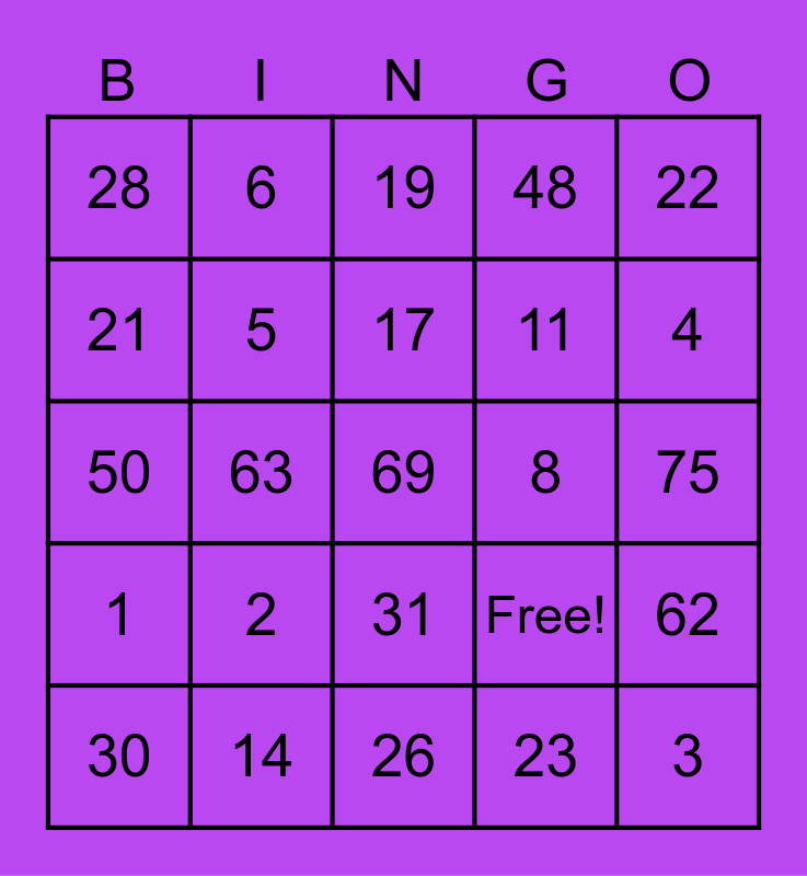 This bingo card has 25 words: 2, 26, 17, 30, 22, 28, 21, 6, 8, 31, 11, 50, Free!, 62, 5, 3, 75, 19, 4, 63, 69, 14, 1, 48 and 23.