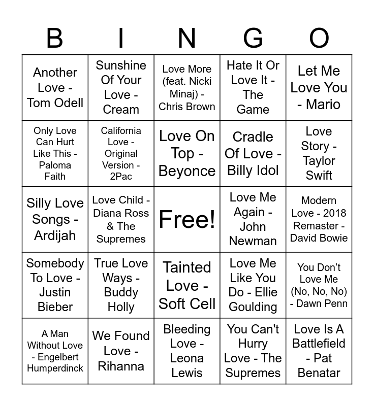 This bingo card has a free space and 57 words: (I Can't Help) Falling In Love With You - UB40, A Man Without Love - Engelbert Humperdinck, All You Need Is Love - The Beatles, Another Love - Tom Odell, Bleeding Love - Leona Lewis, Burning Love - Elvis Presley, California Love - Original Version - 2Pac, Come and Get Your Love - Single Version - Redbone, Cradle Of Love - Billy Idol, Endless Love - Lionel Richie, Hate It Or Love It - The Game, I Love Rock 'N Roll - Joan Jett & the Blackhearts, i love you - Billie Eilish, I Want to Know What Love Is - Foreigner, I Will Always Love You - Whitney Houston, Is This Love - Bob Marley & The Wailers, Let Me Love You - Mario, Love Child - Diana Ross & The Supremes, Love Her Madly - The Doors, Love Is A Battlefield - Pat Benatar, Love Me Again - John Newman, Love Me Do - Remastered 2009 - The Beatles, Love Me Like You Do - Ellie Goulding, Love More (feat. Nicki Minaj) - Chris Brown, Love On The Brain - Rihanna, Love On Top - Beyonce, Love Shack - The B-52's, Love Song - Sara Bareilles, Love Story - Taylor Swift, Love The Way You Lie - Eminem, Love The Way You Lie (Part II) - Pt. 2 - Rihanna, Love Train - The O'Jays, Love You Like A Love Song - Selena Gomez & The Scene, Love Yourself - Justin Bieber, Modern Love - 2018 Remaster - David Bowie, Only Love Can Hurt Like This - Paloma Faith, Savage Love - Jawsh 685, Silly Love Songs - Ardijah, Somebody To Love - Queen, Somebody To Love - Justin Bieber, Sunshine Of Your Love - Cream, Tainted Love - Soft Cell, The Best of My Love - Eagles, The Look Of Love - Dusty Springfield, The Power of Love - Céline Dion, This Love - Maroon 5, True Love Ways - Buddy Holly, We Found Love - Rihanna, What's Love Got to Do with It - Tina Turner, When a Man Loves a Woman - Michael Bolton, Whole Lotta Love - Led Zeppelin, You Can't Hurry Love - The Supremes, You Give Love A Bad Name - Bon Jovi, Your Love Is My Drug - Kesha, Lovely - Billie Eilish ft Khalid, You Don’t Love Me (No, No, No) - Dawn Penn and Lovefool - The Cardigans.